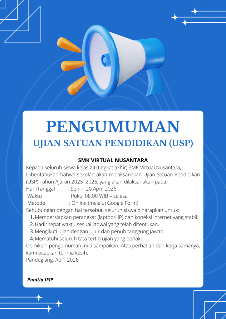 PENGUMUMAN RESMI SMK VIRTUAL NUSANTARA Kepada seluruh siswa kelas XII (tingkat akhir) SMK Virtual Nusantara, Diberitahukan bahwa sekolah akan melaksanakan Ujian Satuan Pendidikan (USP) Tahun Ajaran 2025–2026, yang akan dilaksanakan pada: Hari/Tanggal : Senin, 20 April 2026 Waktu : Pukul 08.00 WIB – selesai Metode : Online (melalui […]